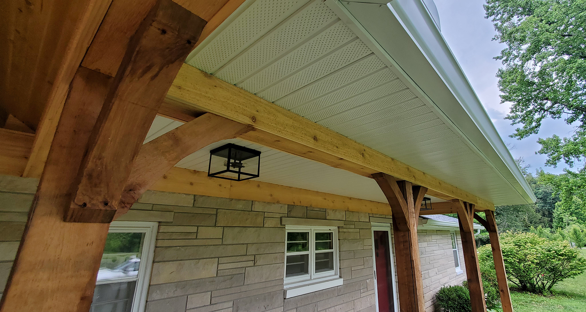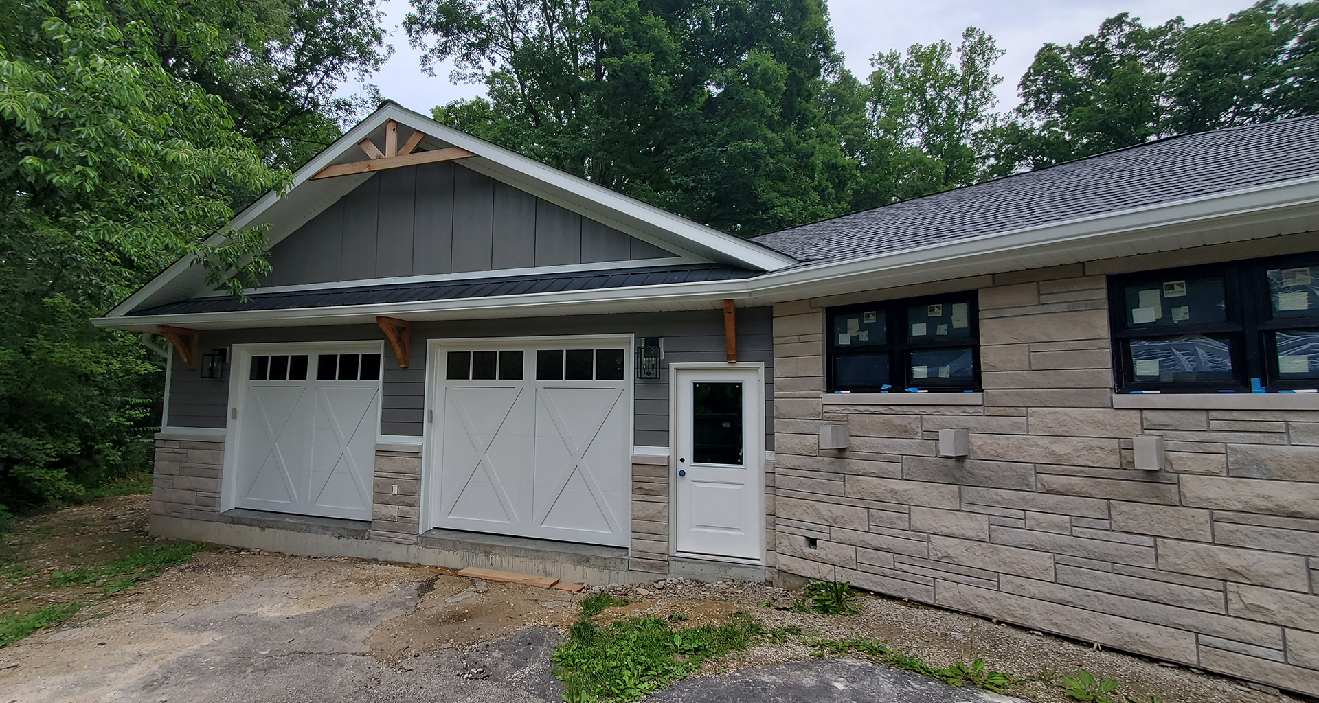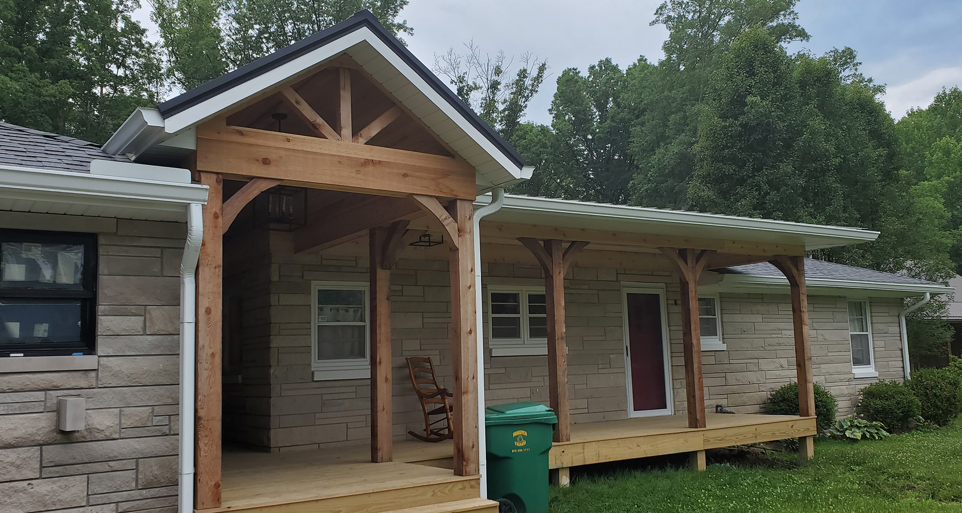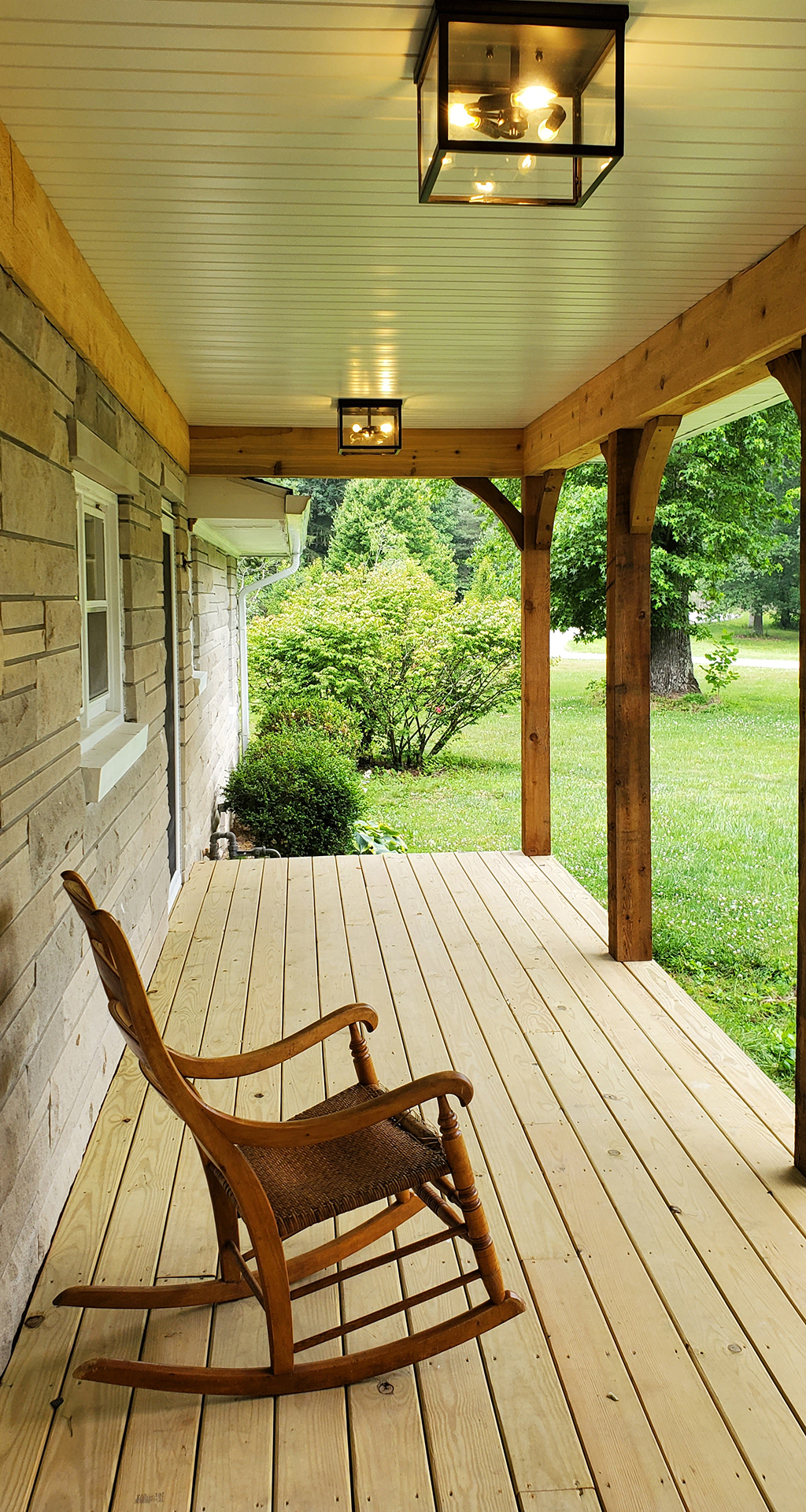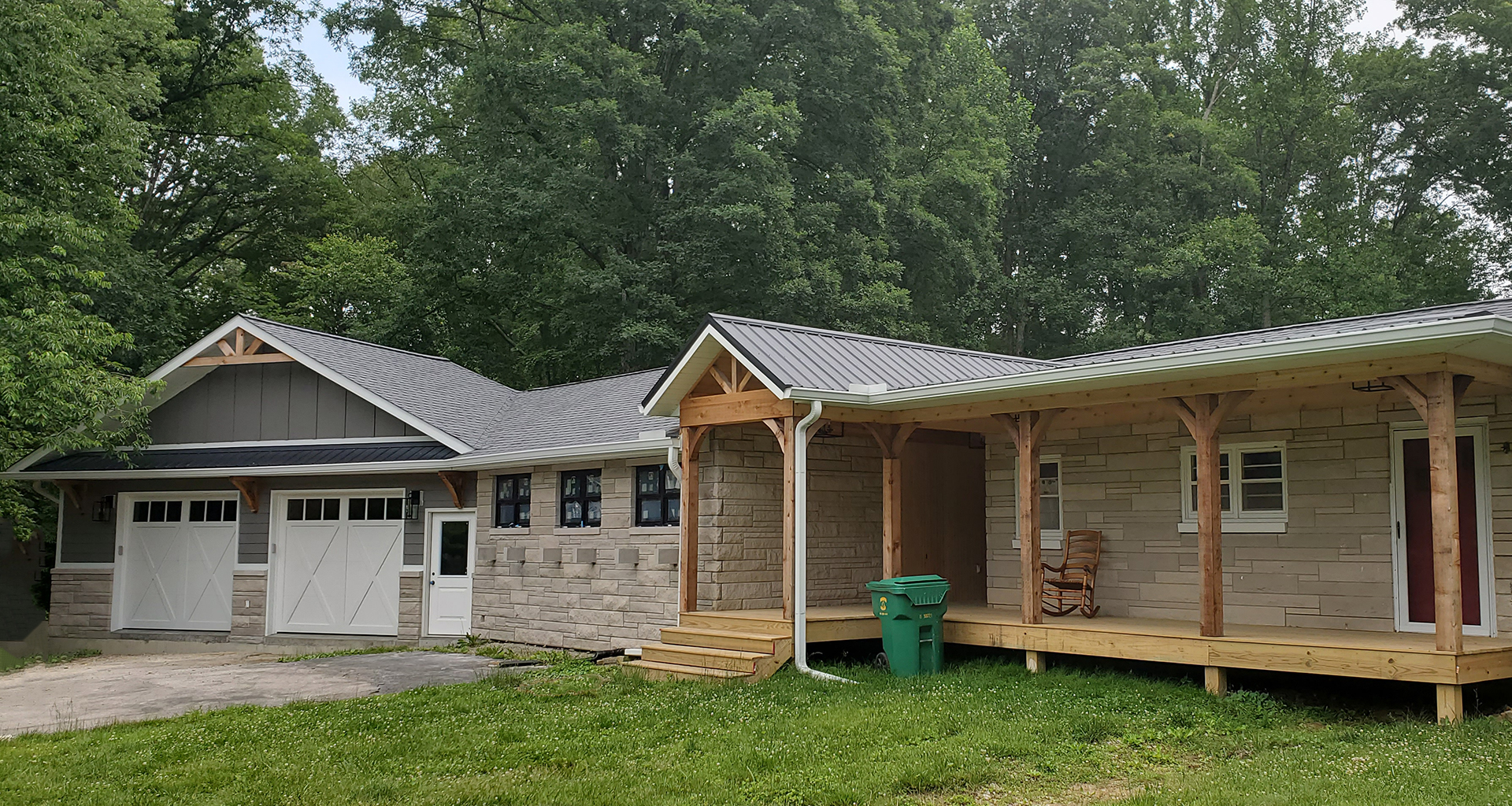 We love 1950's ranch style houses and appreciate any time we get to add a little something to one. This is a beautiful limestone ranch house built in the early 1950's. We took the existing garage and turned that into living space. We moved the kitchen into the old garage and opened up the ceilings in the new space and the old. A two car garage was angled off the side and a front porch was added. Wood accents, beams and carsiding were used to make the ranch feel more like a country retreat.